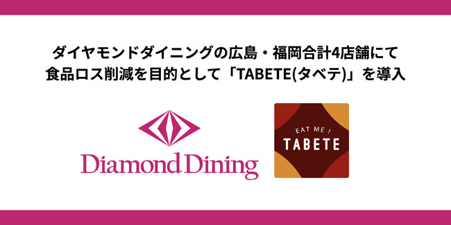 プレスリリース集ダイヤモンドダイニングの広島・福岡合計4店舗にて「TABETE(タベテ)」を導入。食品ロス削減とSDGsへの取り組み推進を目指す。