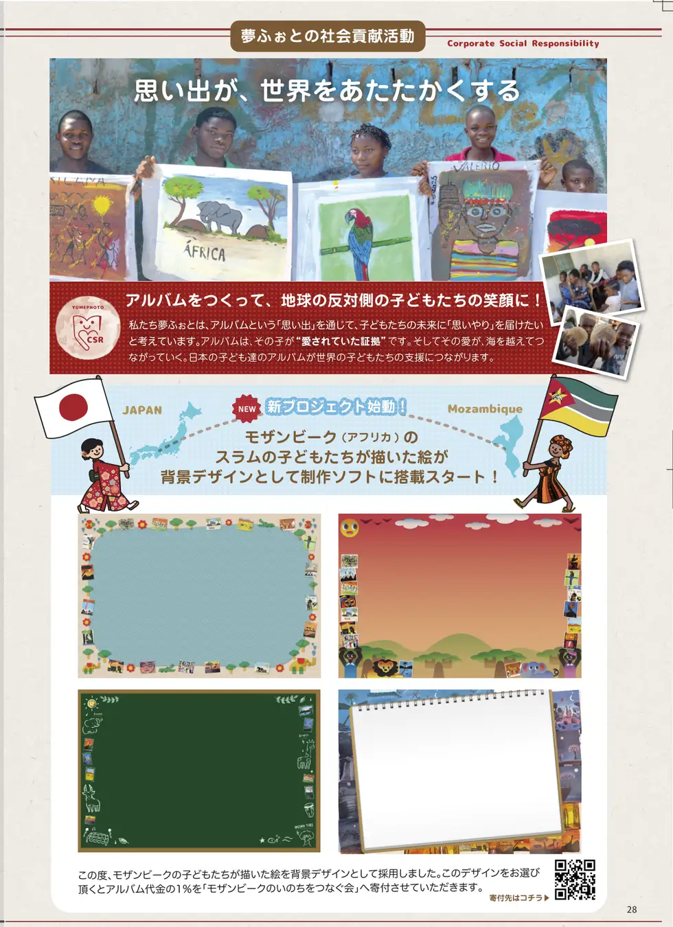 現地で教育や衛生環境の改善に取り組む日本のNGO「モザンビークのいのちをつなぐ会」(拠点:カーボ・デルガド州ペンバ)と協力し、アルバム1冊につき背景テンプレート1点を選ぶ=販売価格の1%を寄付する“循環型モデル”を導入。