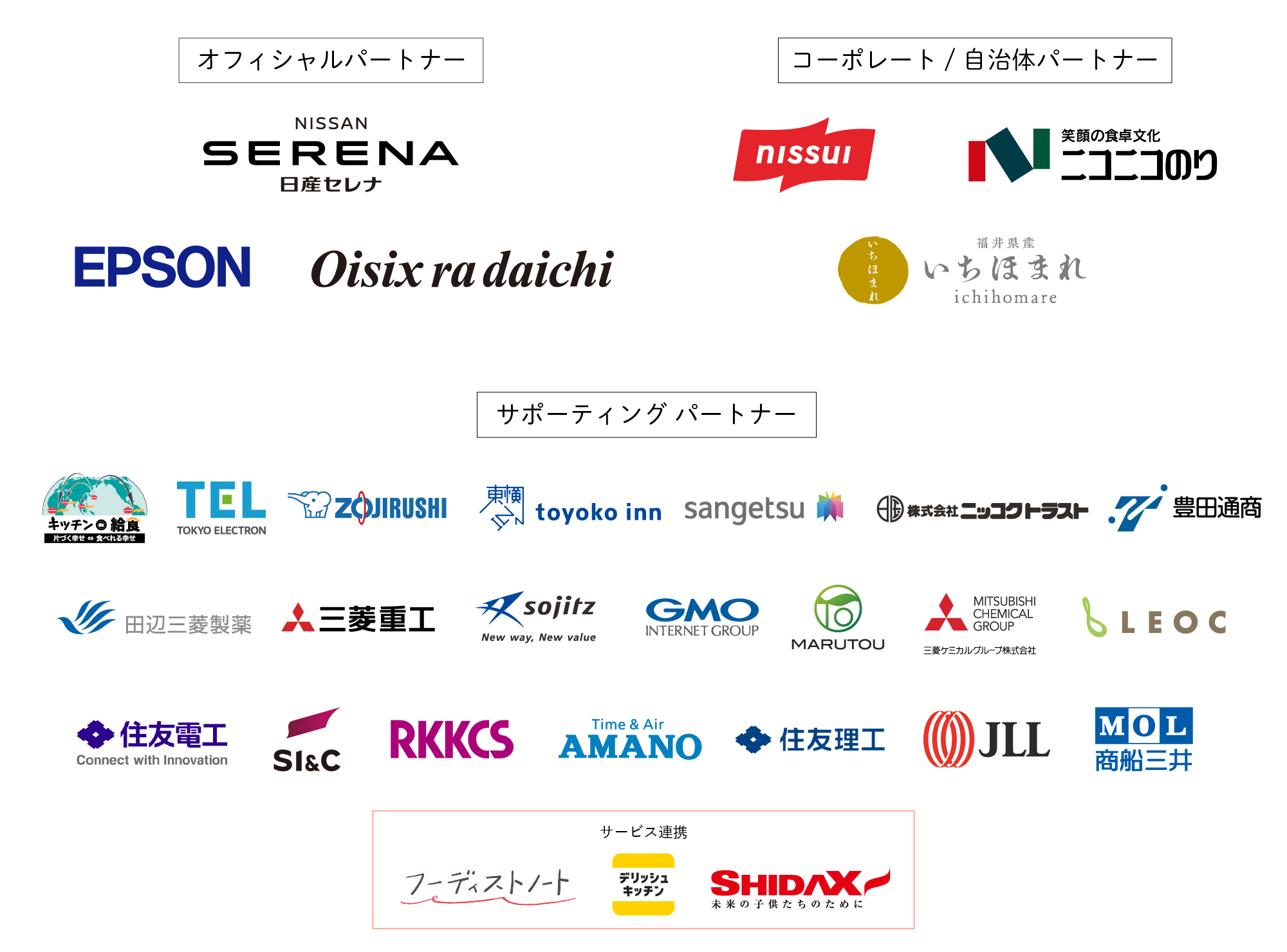サポーティングパートナー:キッチンde給食、東京エレクトロン、象印マホービン、東横イン、サンゲツ、ニッコクトラスト、豊田通商、田辺三菱製薬、三菱重工業、双日、GMOインターネットグループ、丸東、三菱ケミカルグループ、LEOC、住友電気工業、SI&C、RKKCS、アマノ、住友理工、ジョーンズ ラング ラサール、商船三井、フーディストノート、デリッシュキッチン、シダックスコントラクトフードサービス