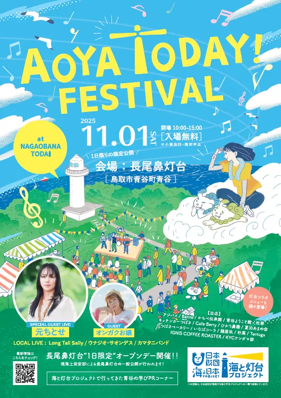 鳥取市青谷地区振興プロジェクト実行委員会は、2025年11月1日にAOYA TODAY FESTIVALを開催いたします。このイベントは、日本財団「海と日本プロジェクト」の一環として、灯台を中心に地域の海の記憶を掘り起こし、地域と地域、異分野と異業種、⽇本と世界をつなぎ、新たな海洋体験を創造していく「海と灯台プロジェクト」の助成を受けて実施します。