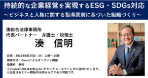 湊総合法律事務所『持続的な企業経営を実現するESG・SDGs対応~ビジネスと人権に関する指導原則に基づいた組織づくり~』 8月25日(木)に無料オンラインにて開催