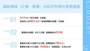 株式会社サイラット【福祉のBCP対策の実態とは】事業者の64.4%が「BCP対策」を実施 6割以上が自家発電機を、約半数が蓄電池を設置